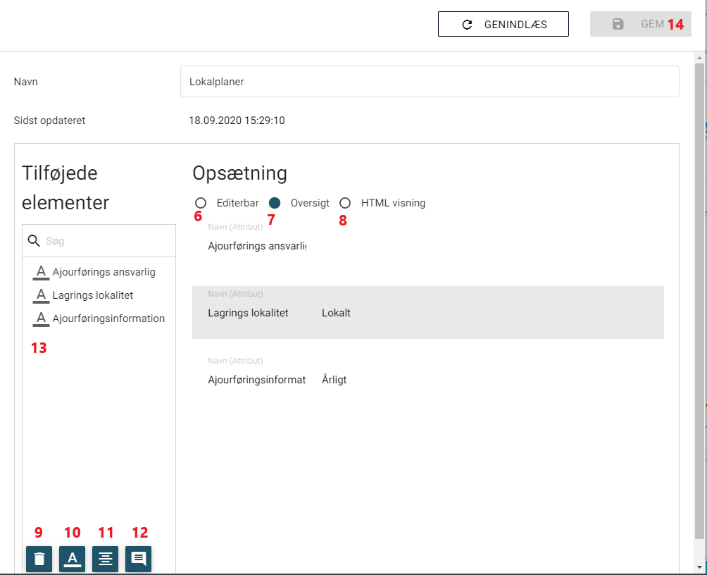 - Når der skal editeres i elementerne vælges (6), hvorefter editeringen slås til for