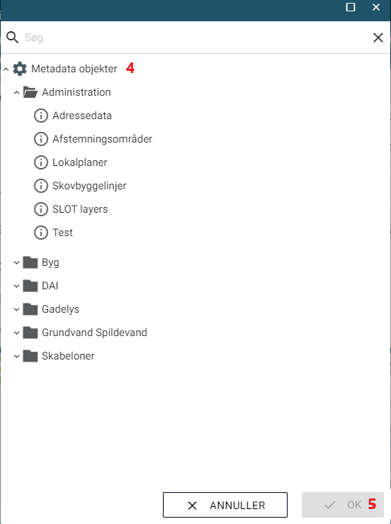og det ønskede metadataobjekt vælges og afslut med at trykke OK (5).
